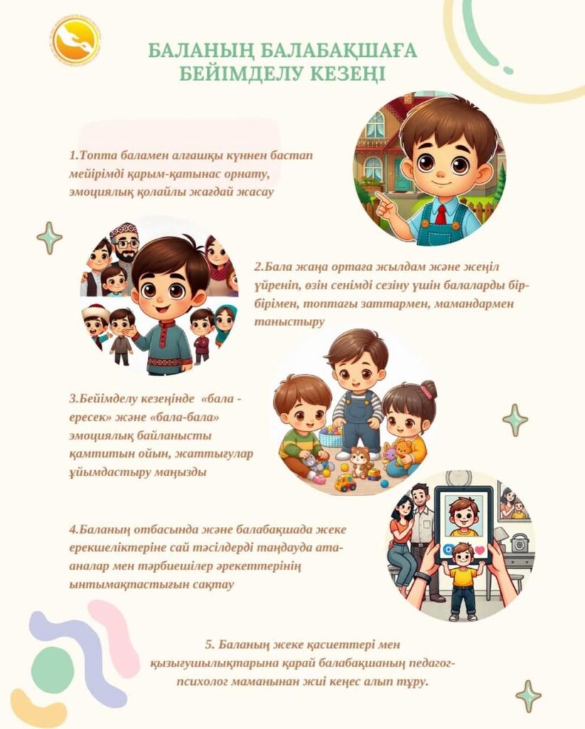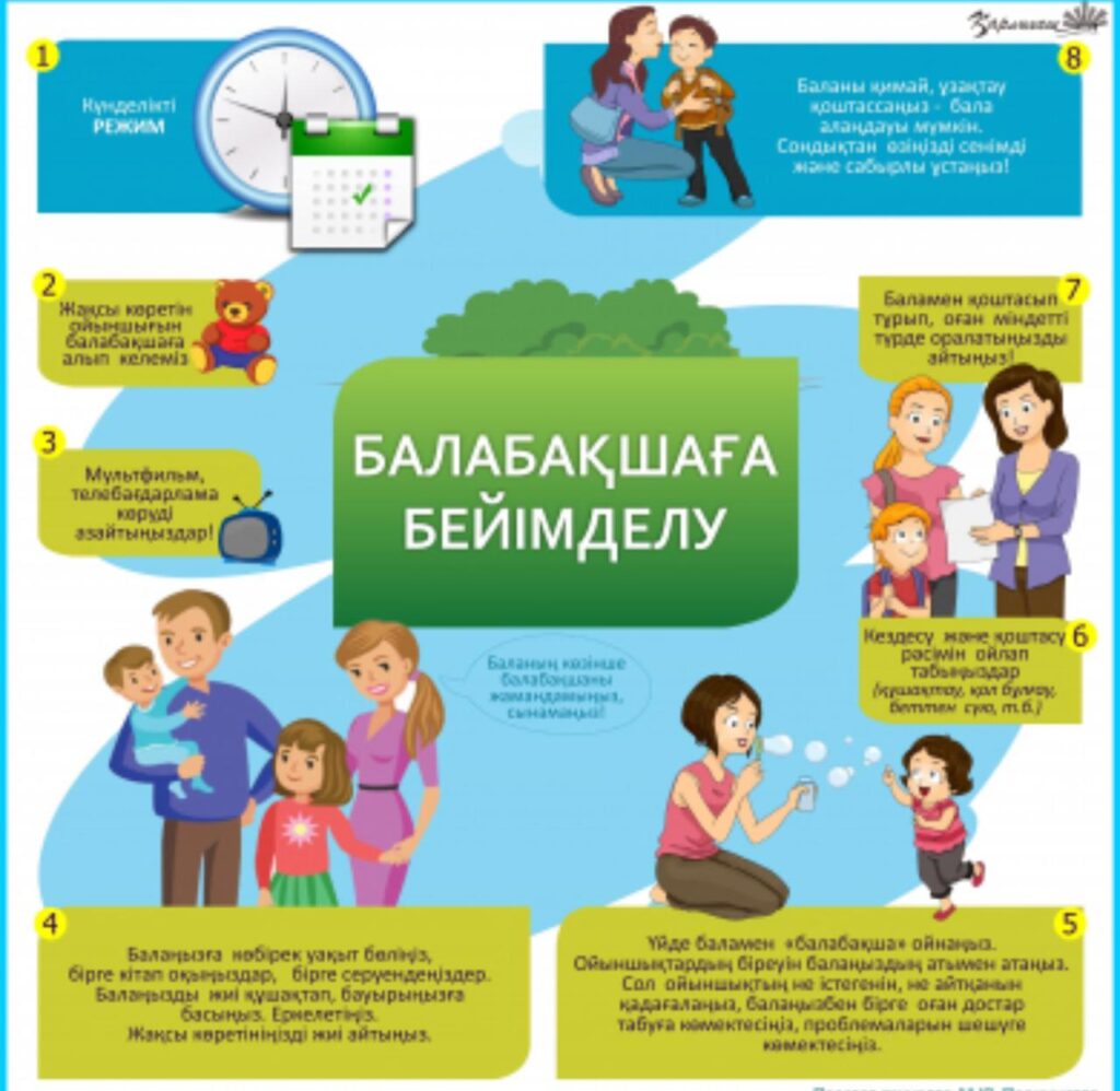 Балабақшаға бейімделу — уақытты қажет ететін табиғи процесс. Ата-ананың сабырлығы, қолдауы және тәрбиешімен бірлескен әрекеті баланың жаңа ортаға тез әрі жеңіл үйренуіне көмектеседі